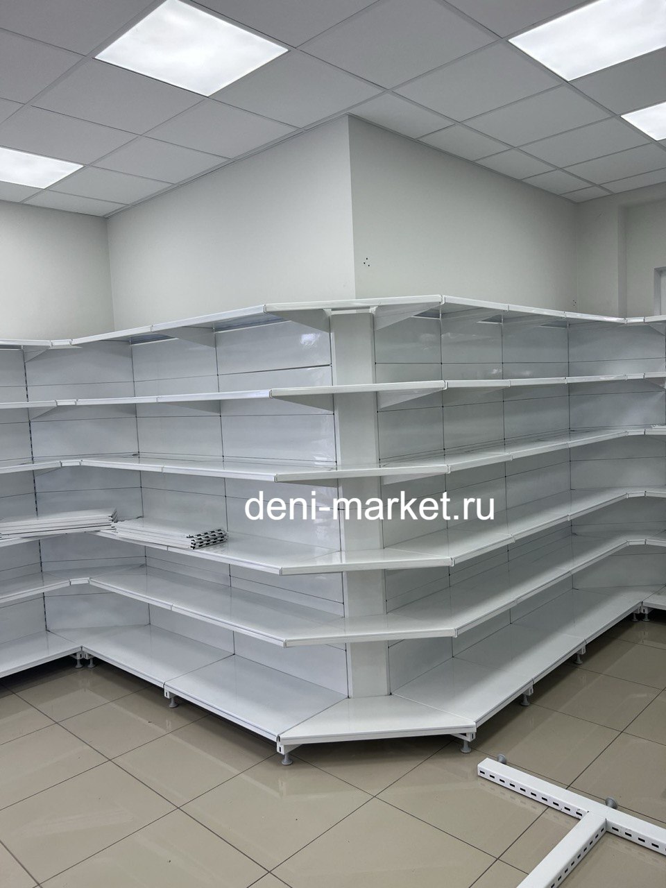 Наружный угловой стеллаж с открытыми полками помогает оптимизировать пространство торговой площади максимально выгодно и просматриваемо.